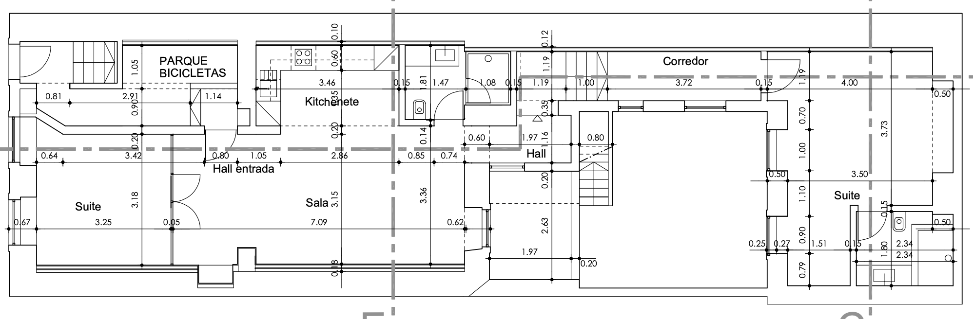 Corredor com espaço para um pequeno escritório e acesso direto ao pátio.