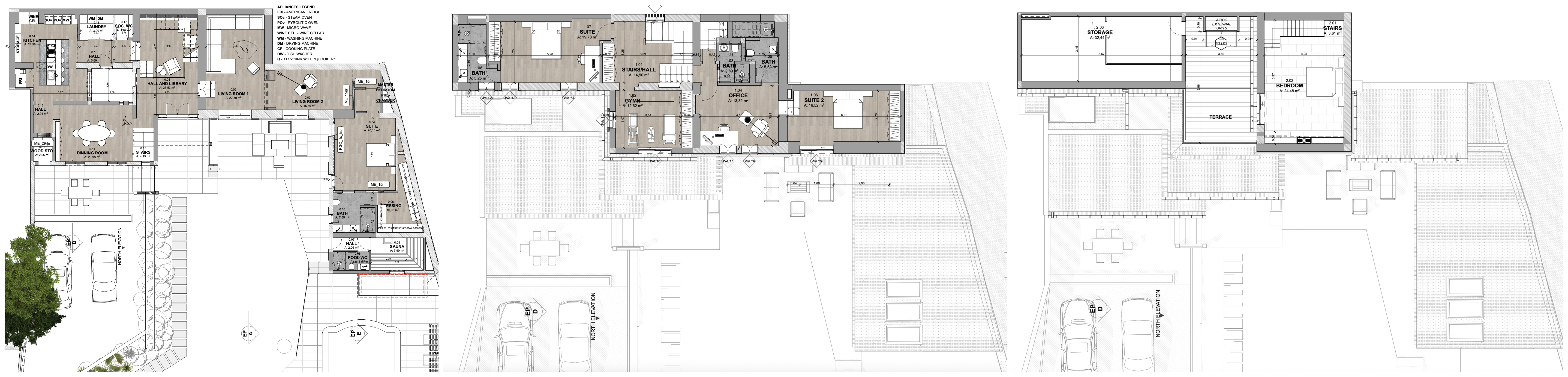 O piso térreo estende-se por mais de 200 m2, com uma ampla sala de estar, seguida de uma sala de televisão, uma biblioteca, uma suíte principal, uma cozinha ampla com acesso direto a um acolhedor jardim de inverno e uma sala de jantar com acesso a uma zona de refeições ao ar livre.